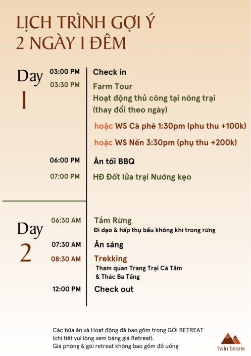 Based on 303 reviewsVerified Beautiful hike, friendly dogs, knowledgeable guide Went on the walk with 7 dogs. Really really beautiful hike. The guide is very knowledgeable and friendly, speaks good English. Visiting the sturgeon farm was very cool as well! Thor Kaspar M2026-01-31Verified Very interesting workshop on beautiful coffee farm Very interesting workshop on a beautiful coffee farm. It’s worth it. The team is very nice and they are doing a great job.We picked coffee beans, roasted our own coffee and did a coffee tasting. It’s a very fair price and they offer a transport from da lat. the group was not too big and we had the chance to get to know our group members better and chat. It’s perfect for coffee enthusiasts and outdoor lovers. Would come again anytime! Alina S2026-01-31Verified Picking and preparing your own coffee Great coffee workshop. Nice to not just see the coffee farm and the process, but actually take part and drink the coffee you made yourself. Jesse was a brilliant guide, thank you ErwinvanVroenhoven2026-01-28Verified Highly recommended for everyone, not only coffee lovers We came to Dalat for a weekend, and I’m so glad that we made time to visit Twin Beans Farm for a coffee workshop.We had a small group of six and were guided through every step of the coffee-making process, starting from harvesting coffee berries ourselves to brewing coffee for tasting.There were small presents, like coffee cherry tea or an aroma sachet, waiting for us — for the one who harvested the most or for the best coffee roaster. You also get to take the coffee you roasted with you!The guide was the key — very knowledgeable, welcoming, and funny — so we enjoyed every minute we spent at the farm.Highly recommended, worth every dime and minute spent! Анна Л2026-01-27Verified Highly recommended! Excellent trekking tour with breathtaking views and great support from the guides. Highly recommended! htracy20182026-01-27Verified Great experience in the heart of the coffee region in Vietnam A very comprehensive tour of the whole coffee growing and making process. Special thanx to Tsuki for a really friendly and knowledgable tour! In just couple of hours you will go through the whole process, from berry picking to coffee tasting. Highly recommend this place and this tour. Виталий Сергеев... М2026-01-26Verified Interesting and fun A knowledgeable guide took us through the full experience from coffee picking to brewing. A really nice afternoon out. MaximRhys2026-01-25Verified A workshop you can enjoy while in Da Lat I had such a wonderful time at this candle workshop! The atmosphere was incredibly calming from the moment I walked in. The instructor was patient and encouraged us to experiment with unique scent combinations—I ended up making a custom blend of tea tree and dried lavender that smells divine. It was the perfect creative escape, and I’m so proud of the professional-looking candle I got to take home. Highly recommend for a solo 'me-time'. Hong Hanh Vo2026-01-24Verified Great Activity The farm is lovely, such a calming atmosphere and I wish we had the chance to stay for a couple of nights. The staff are so so well informed and happy to answer any questions! Hannah C2026-01-21